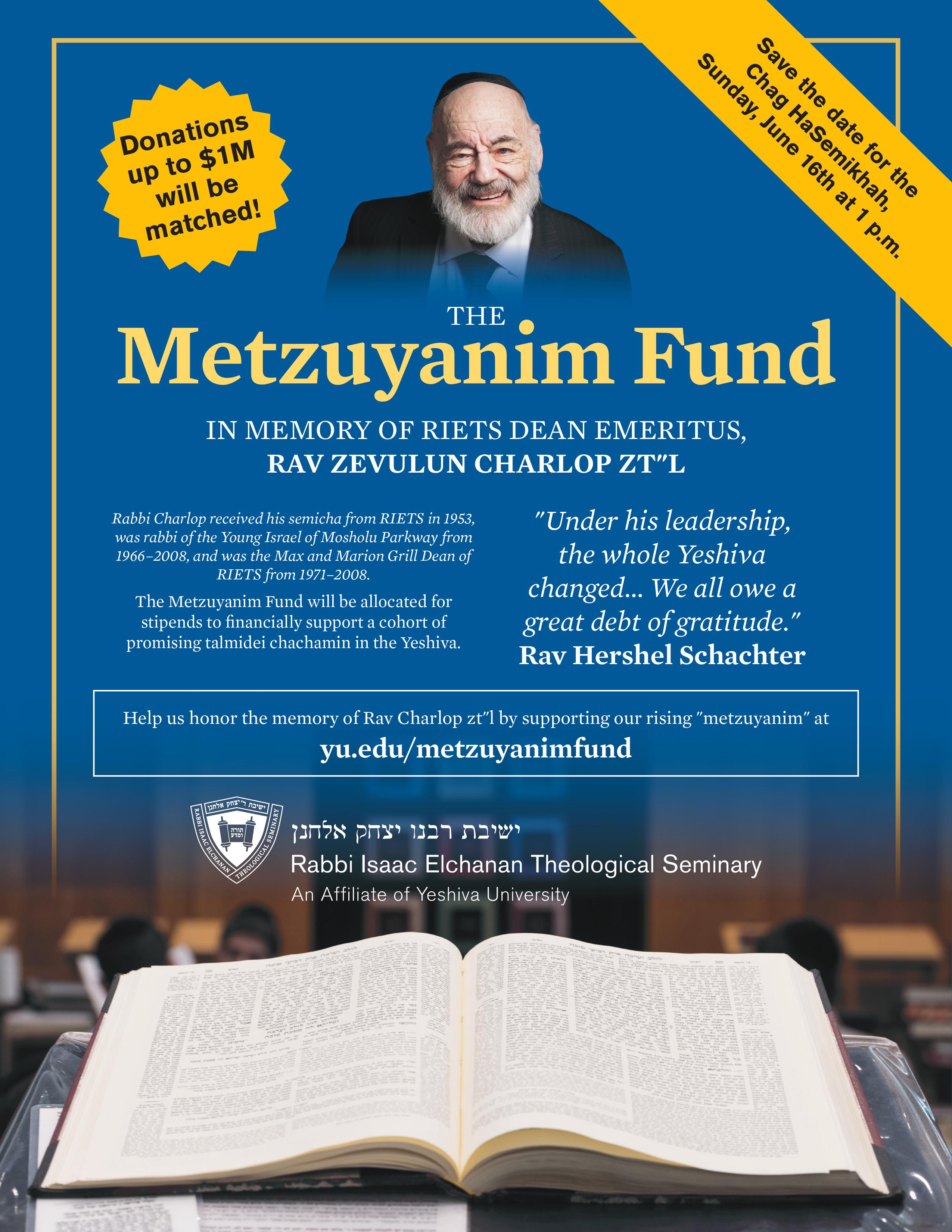Our Dean Emeritus, Rabbi Zevulun Charlop Zt"l, was a pillar of the RIETS community for decades and aided countless talmidim (or, as he would say, "metzuyanim") on their path to becoming rabbanim. As we prepare to celebrate the Chag HaSemikhah, we are privileged to establish the Metzuyanim Fund in his memory to financially support a yearly cohort of promising talmidei chachamim learning in our kollel. Thanks to a generous donor, contributions will be matched up to $1 million! Please consider supporting our rising metzuyanim in order to continue the tradition of excellence and success in learning that Rabbi Charlop embodied. Donations can be made at https://fr.8xgi5.shop/MetzuyanimFund